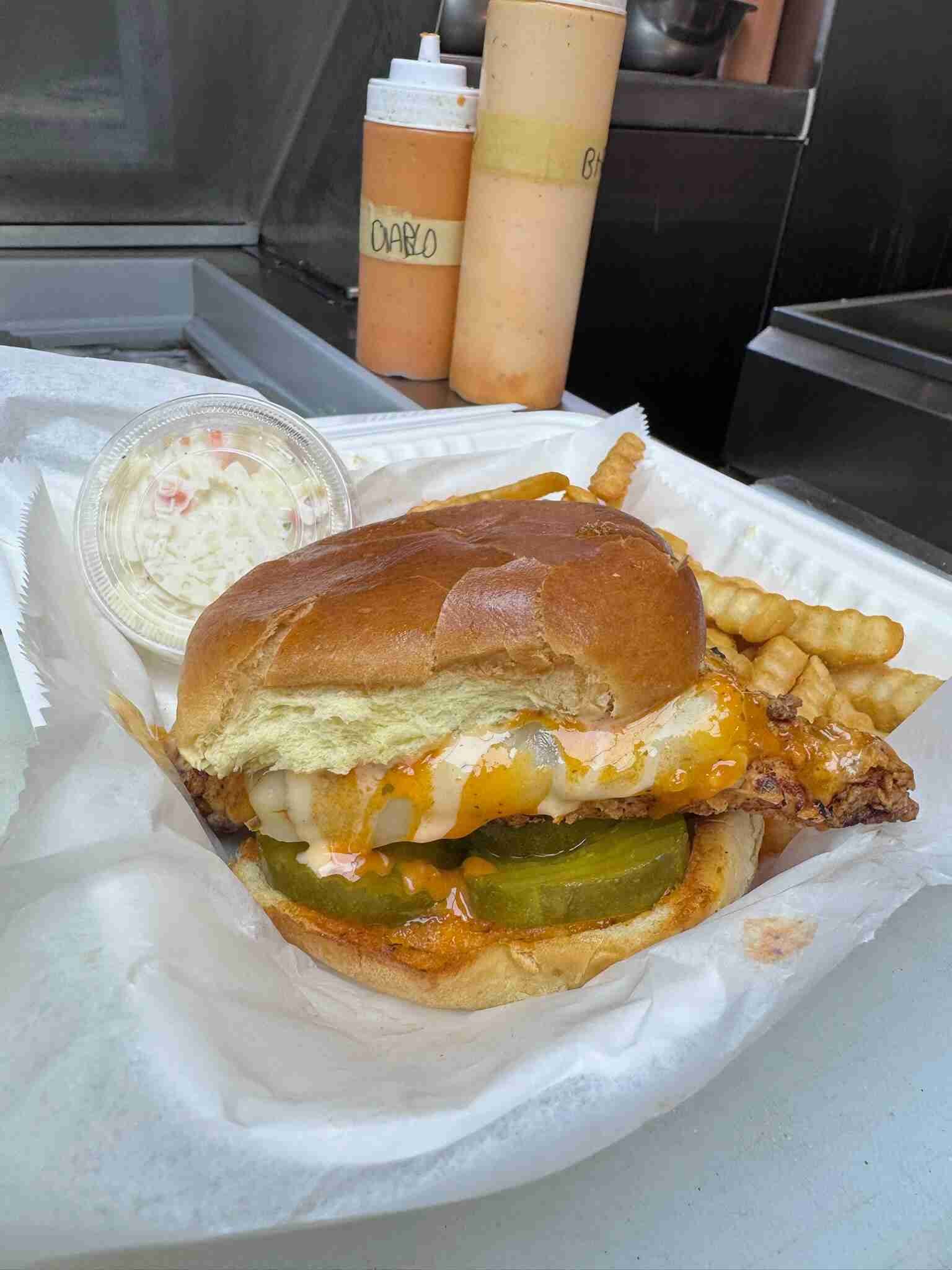 Cooper & Orange American cheese, honey mustard slaw & honey hot sauce.