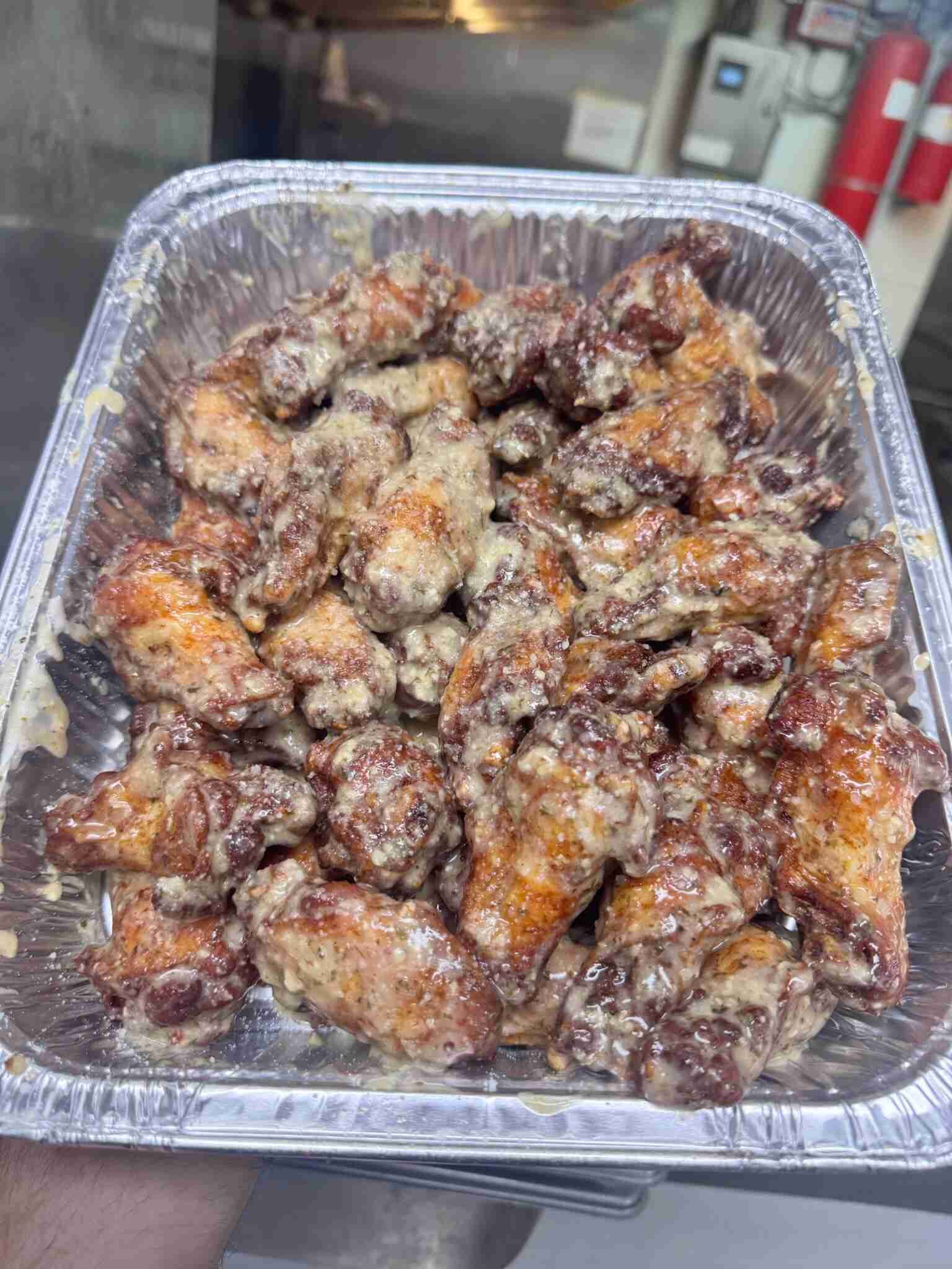 Buffalo garlic parm sauce, blue cheese & cooper cheese.