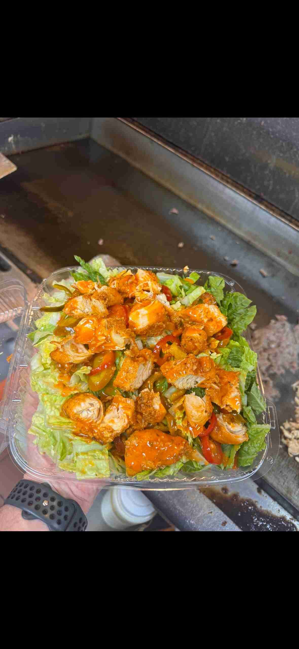 Romaine, cherry tomatoes, cherry peppers, chopped chicken & cheesesteak tossed in our honey buffalo sauce, blue cheese or ranch.