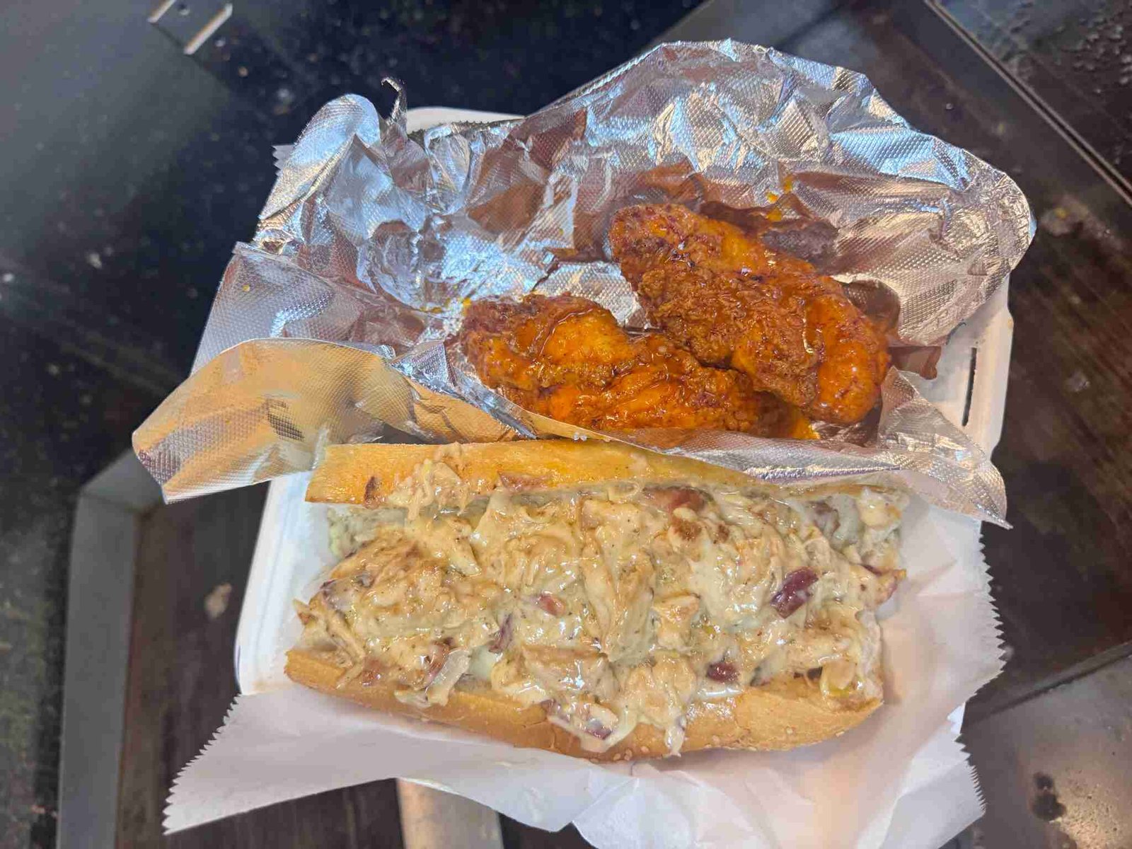 Chicken & Steak, cooper cheese and Batman and robin sauce.